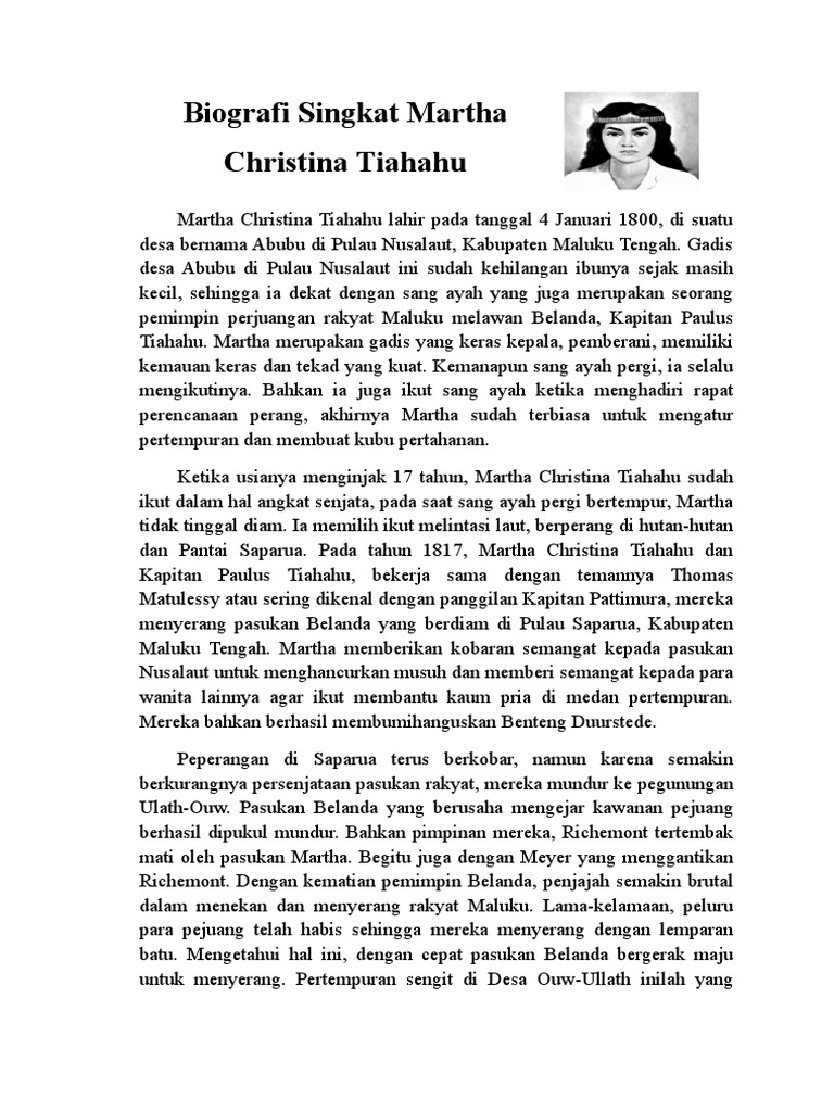 Profil dan Biografi Martha Christina Tiahahu. Ia lahir di Nusa Laut Maluku 4 Januari 1800 dan dibesarkan seorang diri oleh ayahnya Kapitan Paulus Tiahahu yang merupakan kawan baik dari Thomas Mattulessi atau. Maluku adalah daerah yang indah dan subur tanahnya.